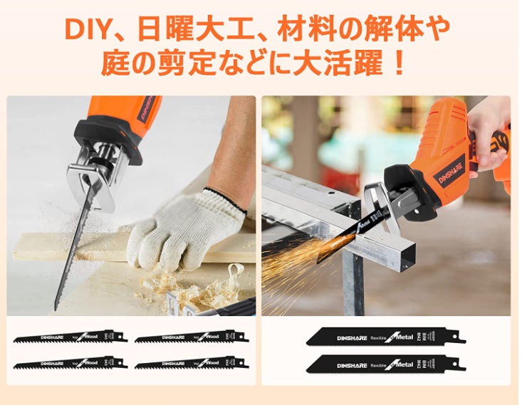 DIY・枝切り・粗大ゴミ解体・アルミニウム切断・薪作りなどいろんな分野に大活躍!ノコ刃を6本付き、金属、木材、プラスチックなどの様々な素材を素速く切断可能です。リフォーム、設備・配管工事など、狭い場所での切断にもおすすめです。また、木材加工、ビニールパイプ、園芸のトリミング、プラスチックや合成材料の切断などに適しています。