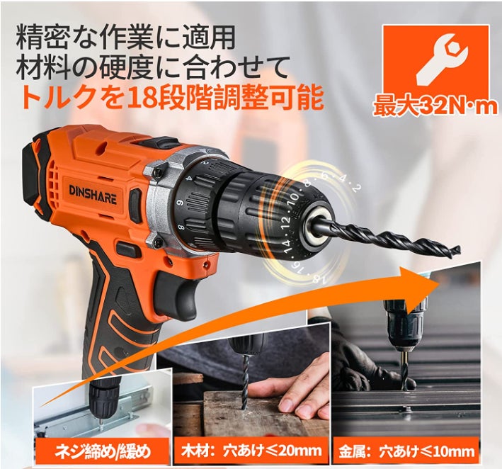 DINSHAREドリルドライバーによる最大トルク32N·m、効率よく作業スピートとパワーを実現しました。更に、18+1段階のトルク調整機能が付いて、柔らかい材料、厚みや固さのある材料など、幅広い用途に応じてトルクを選びます。ネジを締める機能だけではなく、穴をあける機能もできます。日常生活におすすめの製品です。